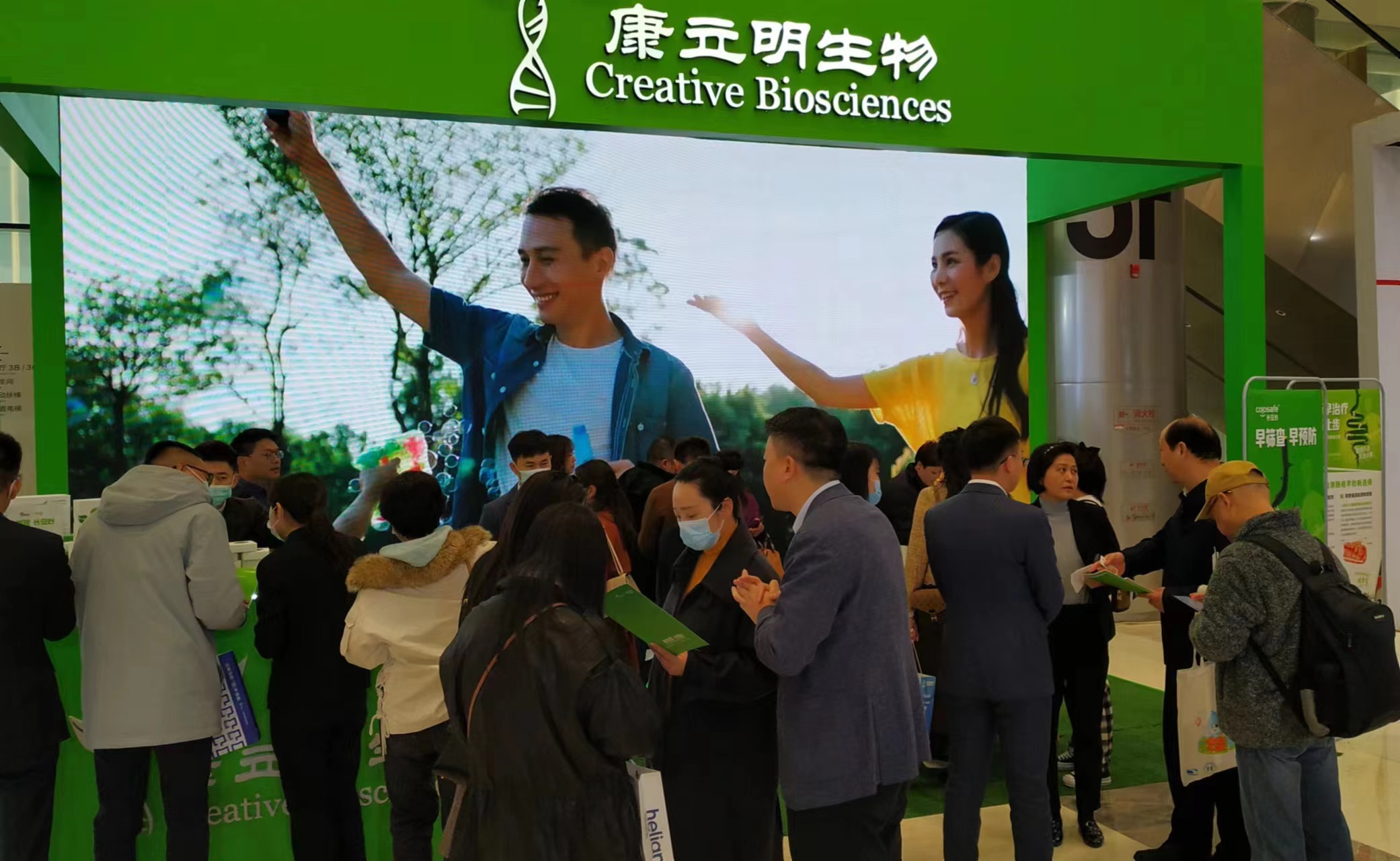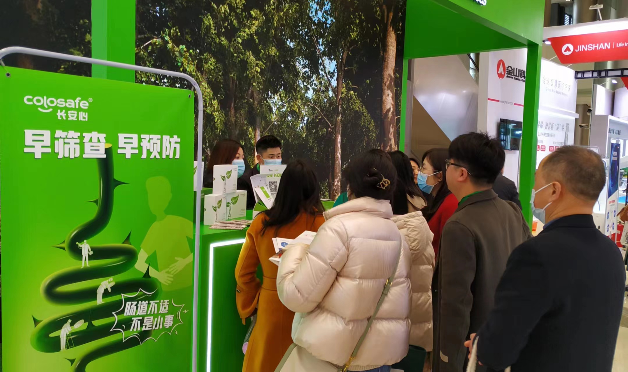 康立明生物攜長安心®糞便DNA腸癌檢測產(chǎn)品參展??盗⒚魃镎刮灰源笞匀粸樵兀源砩腿f物生長的綠色為抽象概念,構(gòu)建出一個Green Box,與現(xiàn)場展出的長安心®小盒子,在形態(tài)到寓意上相呼應,吸引了眾多專家、嘉賓到康立明生物展位打卡、交流,探討長安心®為健康管理系統(tǒng)提供的價值與成效。