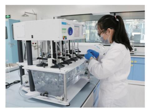 眾生睿創(chuàng)被黃埔區(qū)評為潛在獨角獸企業(yè),并入選首屆粵港澳大灣區(qū)新經(jīng)濟先鋒企業(yè) 50 強。圖為科研工作者在操作自動取樣溶出儀。張玉榮 / 攝