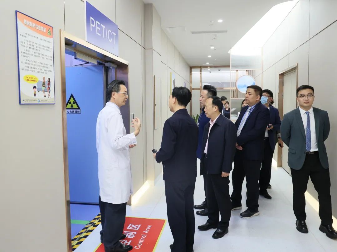 白書忠部長一行首先參觀了醫(yī)院門診大廳、影像科、國際醫(yī)療部、放療中心等,了解各科業(yè)務(wù)及各功能區(qū)域的基本情況。影像科主任周智洋主任詳細(xì)介紹了科室設(shè)備、人員配置,醫(yī)療服務(wù)內(nèi)容等基本情況,并著重介紹了前海人壽廣州總醫(yī)院區(qū)域首臺(tái)PET-CT設(shè)備及取得的良好成效。