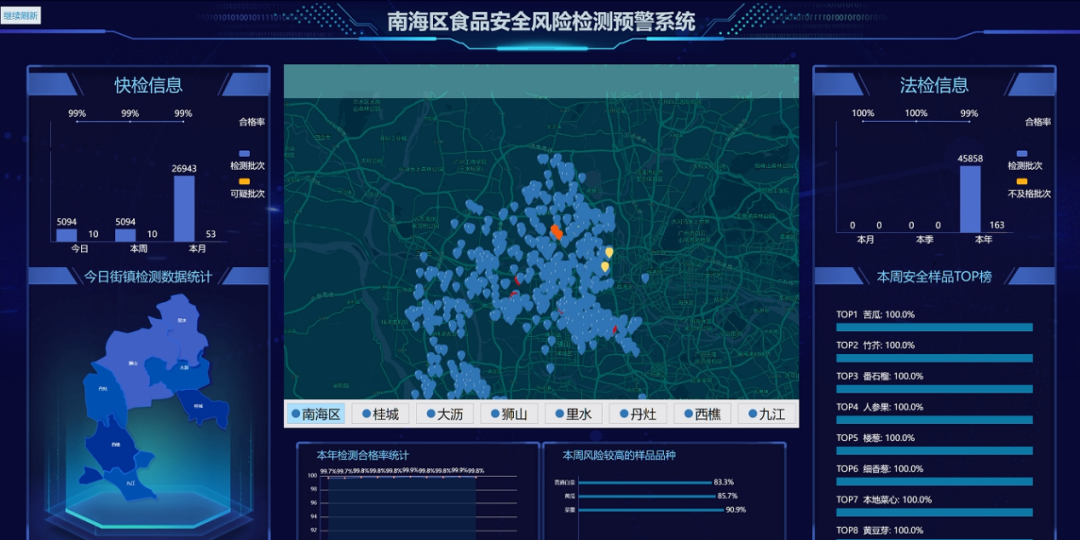 在食品安全風(fēng)險(xiǎn)檢測(cè)預(yù)警系統(tǒng)平臺(tái)首頁(yè),“南海區(qū)食品快檢數(shù)據(jù)”地圖上顯示南海區(qū)900多個(gè)監(jiān)測(cè)點(diǎn)以及其近一周的檢測(cè)情況,另外還設(shè)有“今日鎮(zhèn)街檢測(cè)數(shù)據(jù)統(tǒng)計(jì)”“本年檢測(cè)合格率”“本周風(fēng)險(xiǎn)較高的樣品品種”“本周安全用品TOP”榜、“快檢信息”“法檢信息”六大模塊內(nèi)容。