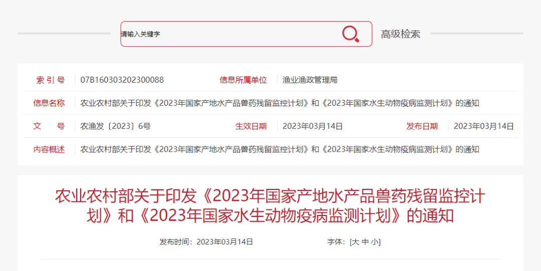 各省、自治區(qū)、直轄市農(nóng)業(yè)農(nóng)村(農(nóng)牧)、漁業(yè)廳(局、委),計(jì)劃單列市漁業(yè)主管局,新疆生產(chǎn)建設(shè)兵團(tuán)農(nóng)業(yè)農(nóng)村局,各有關(guān)單位: 為提升養(yǎng)殖水產(chǎn)品質(zhì)量安全和生物安全水平,保障水產(chǎn)品安全有效供給,推進(jìn)水產(chǎn)養(yǎng)殖業(yè)綠色高質(zhì)量發(fā)展,根據(jù)《中華人民共和國漁業(yè)法》、《中華人民共和國農(nóng)產(chǎn)品質(zhì)量安全法》、《中華人民共和國動物防疫法》、《獸藥管理?xiàng)l例》等法律法規(guī),我部制定了《2023年國家產(chǎn)地水產(chǎn)品獸藥殘留監(jiān)控計(jì)劃》、《2023年國家水生動物疫病監(jiān)測計(jì)劃》?,F(xiàn)印發(fā)給你們,請認(rèn)真組織實(shí)施執(zhí)行。有關(guān)要求通知如下。 (一)農(nóng)業(yè)農(nóng)村部漁業(yè)漁政管理局負(fù)責(zé)監(jiān)督管理水產(chǎn)養(yǎng)殖用獸藥及其他投入品的使用,負(fù)責(zé)提出和組織國家產(chǎn)地水產(chǎn)品獸藥殘留監(jiān)控計(jì)劃和國家水生動物疫病監(jiān)測計(jì)劃,發(fā)布監(jiān)控(測)結(jié)果,組織分析研判養(yǎng)殖水產(chǎn)品的質(zhì)量安全和養(yǎng)殖水生生物的生物安全形勢。 (二)中國水產(chǎn)科學(xué)研究院(以下稱“水科院”)負(fù)責(zé)具體組織實(shí)施國家產(chǎn)地水產(chǎn)品獸藥殘留監(jiān)控計(jì)劃,對各地監(jiān)控工作給予技術(shù)指導(dǎo)。中國水產(chǎn)科學(xué)研究院質(zhì)量與標(biāo)準(zhǔn)研究中心(以下稱“水科院質(zhì)標(biāo)中心”)負(fù)責(zé)國家產(chǎn)地水產(chǎn)品獸藥殘留監(jiān)控計(jì)劃抽檢結(jié)果的匯總、分析和會商等工作。國家水產(chǎn)品質(zhì)量監(jiān)督檢驗(yàn)中心等水產(chǎn)品質(zhì)檢機(jī)構(gòu)(以下稱“質(zhì)檢機(jī)構(gòu)”)負(fù)責(zé)協(xié)助開展國家產(chǎn)地水產(chǎn)品獸藥殘留監(jiān)控計(jì)劃的抽樣、檢測和結(jié)果報送等工作。 (三)全國水產(chǎn)技術(shù)推廣總站負(fù)責(zé)具體組織實(shí)施國家水生動物疫病監(jiān)測計(jì)劃,組織各省級水生動物疫病預(yù)防控制(水產(chǎn)養(yǎng)殖病害防治、水產(chǎn)技術(shù)推廣)機(jī)構(gòu)(以下稱“省級水生動物疫控機(jī)構(gòu)”),協(xié)調(diào)水生動物疫病參考實(shí)驗(yàn)室和相關(guān)檢測機(jī)構(gòu),開展全國水生動物疫病監(jiān)測,指導(dǎo)各省份開展監(jiān)測、凈化與評估工作;組織首席專家開展監(jiān)測信息的分析評估、疫病形勢會商和疫情預(yù)警工作;及時完成監(jiān)測結(jié)果匯總、分析和上報;發(fā)生突發(fā)水生動物疫情時,及時組織開展緊急監(jiān)測診斷處置工作。負(fù)責(zé)國家產(chǎn)地水產(chǎn)品獸藥殘留監(jiān)控計(jì)劃中水產(chǎn)養(yǎng)殖動物主要病原菌耐藥性監(jiān)測的具體組織實(shí)施工作,負(fù)責(zé)組織各級水產(chǎn)技術(shù)推廣機(jī)構(gòu)和相關(guān)專家開展水產(chǎn)養(yǎng)殖用藥減量行動和規(guī)范用藥科普下鄉(xiāng)活動,及時調(diào)度各地工作情況和總結(jié)。 (四)省級主管部門負(fù)責(zé)組織實(shí)施本轄區(qū)內(nèi)國家產(chǎn)地水產(chǎn)品獸藥殘留監(jiān)控計(jì)劃和國家水生動物疫病監(jiān)測計(jì)劃,加強(qiáng)產(chǎn)地水產(chǎn)品獸藥殘留管控,做好水生動物疫病防控,制定和組織實(shí)施省級產(chǎn)地水產(chǎn)品獸藥殘留監(jiān)控(監(jiān)督抽查)計(jì)劃和水生動物疫病監(jiān)測計(jì)劃,對轄區(qū)內(nèi)各級主管部門開展的產(chǎn)地水產(chǎn)品獸藥殘留監(jiān)控和水生動物疫病監(jiān)測等工作進(jìn)行指導(dǎo)。 (一)加強(qiáng)組織領(lǐng)導(dǎo)。加強(qiáng)養(yǎng)殖水產(chǎn)品質(zhì)量安全監(jiān)管和養(yǎng)殖水生生物疫病防控是保障水產(chǎn)品安全有效供給的基礎(chǔ)。地方各級農(nóng)業(yè)農(nóng)村(漁業(yè))主管部門務(wù)必要高度重視這兩項(xiàng)工作,強(qiáng)化組織領(lǐng)導(dǎo),細(xì)化職責(zé)分工,壓實(shí)各級責(zé)任,加強(qiáng)部門聯(lián)動,不折不扣地完成國家產(chǎn)地水產(chǎn)品獸藥殘留監(jiān)控計(jì)劃和國家水生動物疫病監(jiān)測計(jì)劃的各項(xiàng)工作任務(wù)。 (二)強(qiáng)化經(jīng)費(fèi)保障。依據(jù)《中華人民共和國農(nóng)產(chǎn)品質(zhì)量安全法》、《中華人民共和國動物防疫法》等法律,各地農(nóng)業(yè)農(nóng)村(漁業(yè))部門要將產(chǎn)地水產(chǎn)品獸藥殘留監(jiān)控和水生動物疫病監(jiān)測工作納入本級財政預(yù)算,落實(shí)監(jiān)管責(zé)任,確保工作取得實(shí)效。國家產(chǎn)地水產(chǎn)品獸藥殘留監(jiān)控計(jì)劃和國家水生動物疫病監(jiān)測計(jì)劃中國家負(fù)責(zé)部分所需經(jīng)費(fèi)納入中央財政預(yù)算。 (三)推進(jìn)源頭治理。地方各級農(nóng)業(yè)農(nóng)村(漁業(yè))主管部門要持續(xù)加強(qiáng)水產(chǎn)品質(zhì)量安全和水生生物生物安全的源頭管控,結(jié)合水產(chǎn)綠色健康養(yǎng)殖技術(shù)推廣“五大行動”的實(shí)施,推廣生態(tài)健康養(yǎng)殖技術(shù)模式,升級基礎(chǔ)設(shè)施裝備,配套水產(chǎn)良種和防病技術(shù),規(guī)范日常管理和獸藥使用,持續(xù)提升養(yǎng)殖