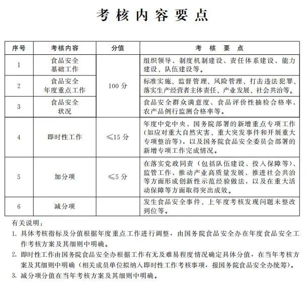 第五條 考核內(nèi)容主要包括食品安全基礎(chǔ)工作推進(jìn)、年度重點(diǎn)工作落實(shí)、食品安全狀況等,同時(shí)設(shè)置即時(shí)性工作評(píng)價(jià)和加減分項(xiàng)(考核內(nèi)容要點(diǎn)見附件)。具體考核指標(biāo)及分值在年度食品安全工作考核方案及其細(xì)則中明確,設(shè)置要科學(xué)合理,可操作、可評(píng)價(jià)、可區(qū)分,切實(shí)減輕基層負(fù)擔(dān)。