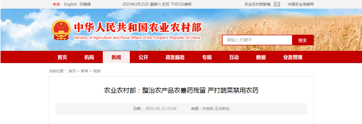 3月21日, 農(nóng)業(yè)農(nóng)村部 ”2023年全國農(nóng)產(chǎn)品質(zhì)量安全監(jiān)管工作會議“在云南省昆明市召開。會議表示,針對一些農(nóng)產(chǎn)品農(nóng)獸藥殘留方面的突出問題將在嚴打蔬菜禁用農(nóng)藥源頭上下功夫。據(jù)介紹,2022年全國農(nóng)產(chǎn)品監(jiān)測合格率達到97.6%,農(nóng)產(chǎn)品質(zhì)量安全形勢持續(xù)向好。但是,農(nóng)產(chǎn)品質(zhì)量安全隱患依然不少,禁用藥物的違法使用雖有下降但并未杜絕,防止常規(guī)農(nóng)藥超標成為新時期的重要任務(wù)。