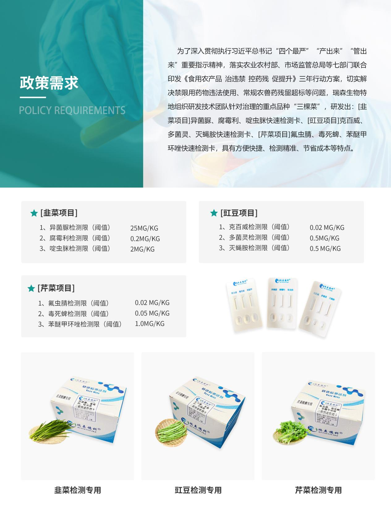 瑞森生物認真學習和貫徹農(nóng)業(yè)農(nóng)村部2023年全國農(nóng)產(chǎn)品質(zhì)量安全監(jiān)管工作會議精神,積極擁護和響應(yīng)《中華人民共和國食品安全法》。早在2021年國家農(nóng)業(yè)農(nóng)村部發(fā)布了《食用農(nóng)產(chǎn)品“治違禁 控藥殘 促提升”三年行動方案》的通知后,瑞森生物就積極擁護和響應(yīng)文件精神,并針對《方案》中提到的需要重點治理的11種農(nóng)產(chǎn)品:“三棵菜”、“一枚蛋”、“一只雞”、”肉牛肉羊“、“四條魚”,推出了相關(guān)的新品應(yīng)對方案,包括”農(nóng)藥殘留膠體金多聯(lián)檢測產(chǎn)品系列“、”禽蛋藥殘專項檢測解決方案“、”熒光定量快速檢測產(chǎn)品“等相關(guān)技術(shù)領(lǐng)先的新型檢測產(chǎn)品。有效解決了國家食用農(nóng)產(chǎn)品存在的安全隱患問題,充分保障了老百姓”菜籃子“上的安全。