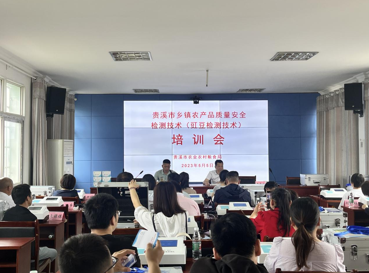 為不斷提升農產品質量安全監(jiān)管能力,鍛造農產品質量安全快速檢測過硬隊伍,保障農產品質量安全。江西省鷹潭市貴溪市農業(yè)農村糧食局于2023年5月5日舉辦了“貴溪市鄉(xiāng)鎮(zhèn)農產品質量安全檢測技術(豇豆檢測技術)培訓會”。貴溪市農糧局分管領導,貴溪市農糧局市場信息與農產品質量安全監(jiān)管股領導及監(jiān)管股各干事、廣州瑞森生物科技股份有限公司相關領導和同事以及貴溪市18個涉農鄉(xiāng)鎮(zhèn)及鷹潭市高新區(qū)白露街道辦事處共40余名檢測員參加本次培訓會議。