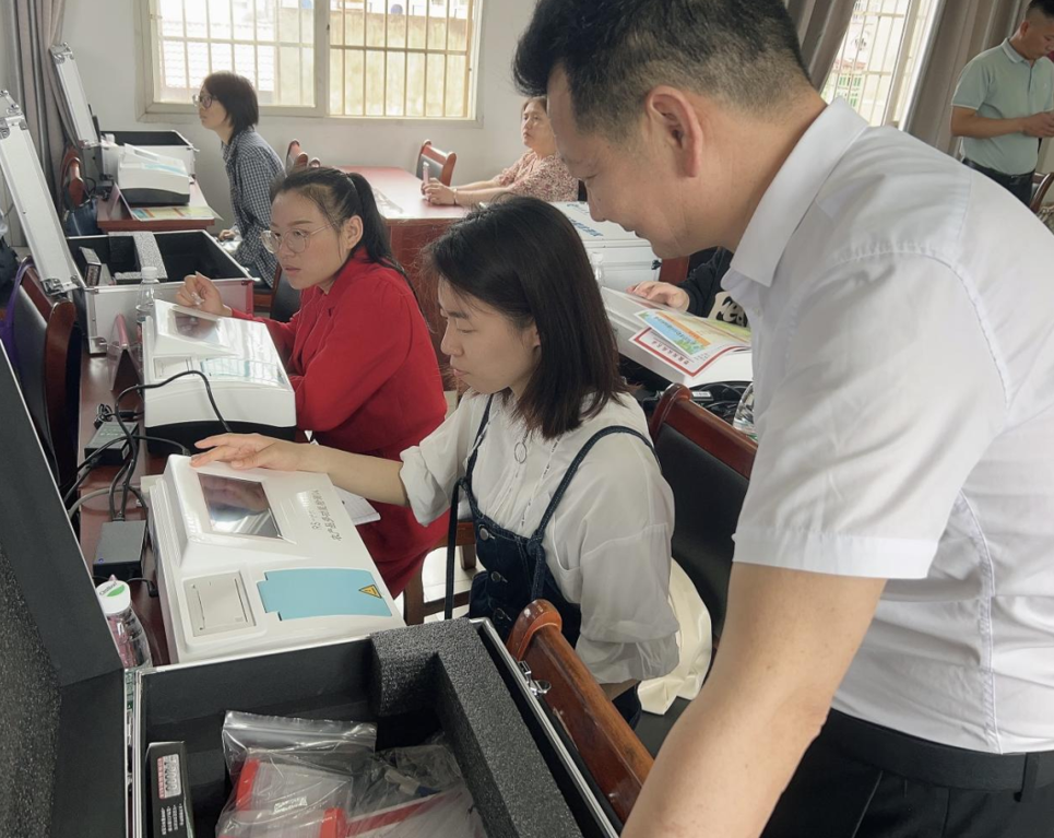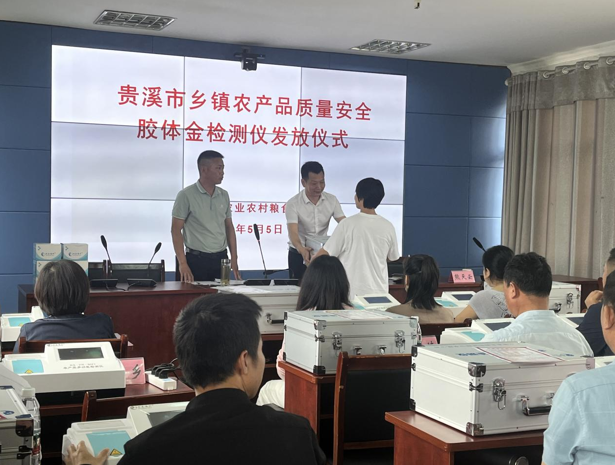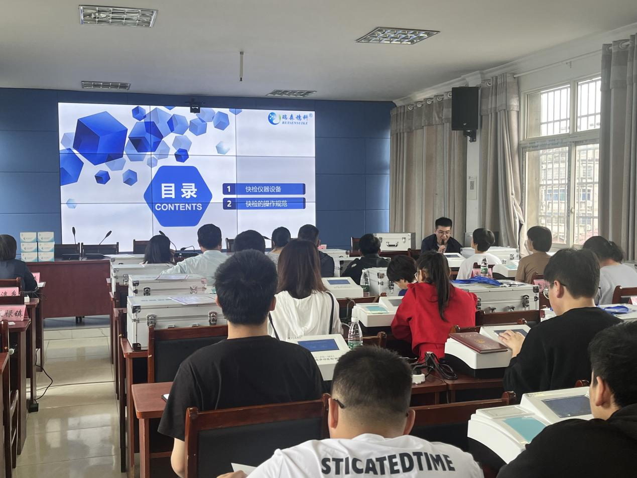 在培訓會上,貴溪市農糧局為全市18個鄉(xiāng)鎮(zhèn)統(tǒng)一配備膠體金、酶抑制多功能快速檢測儀,局分管領導熊天云就新設備使用、豇豆種植及檢測相關注意事項做了強調,并要求大家堅決貫徹落實新農安法,嚴格按照部省共建有關要求開展農安工作,確保及時有效發(fā)現(xiàn)并處置農產品質量安全風險,確保膠體金免疫檢測任務全部按時完成。 瑞森生物技術人員在本次培訓會上,通過現(xiàn)場操作示教的方式,為現(xiàn)場與會人員生動詳細的培訓了膠體金快速檢測儀的操作使用方法、使用膠體金檢測卡對蔬菜農藥殘留進行快速檢測示范操作以及畜禽產品獸藥殘留檢測等相關內容。并現(xiàn)場考核了各鄉(xiāng)鎮(zhèn)檢測人員對韭菜、空心菜、西葫蘆、豬肉、牛尿等常見農產品的膠體金卡檢測操作能力。